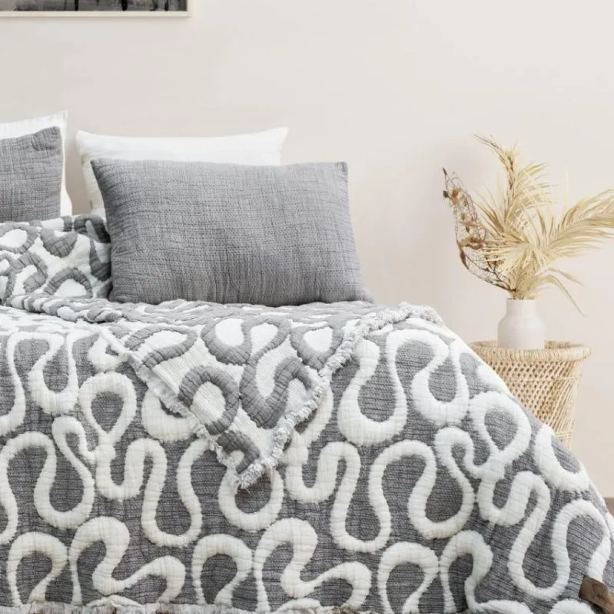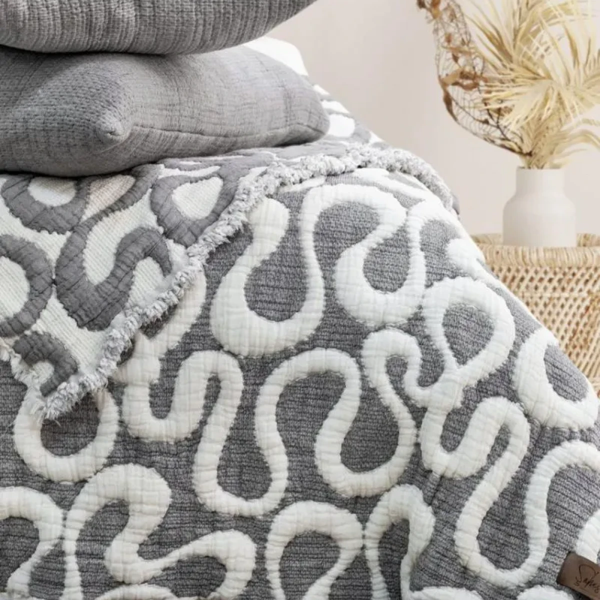 • Стильне дизайнерське рішення: Унікальна фактура та ретельно підібраний колір (Антрацит) дозволяють цьому текстилю стати справжнім акцентом вашої кімнати, підкреслюючи смак господарів.