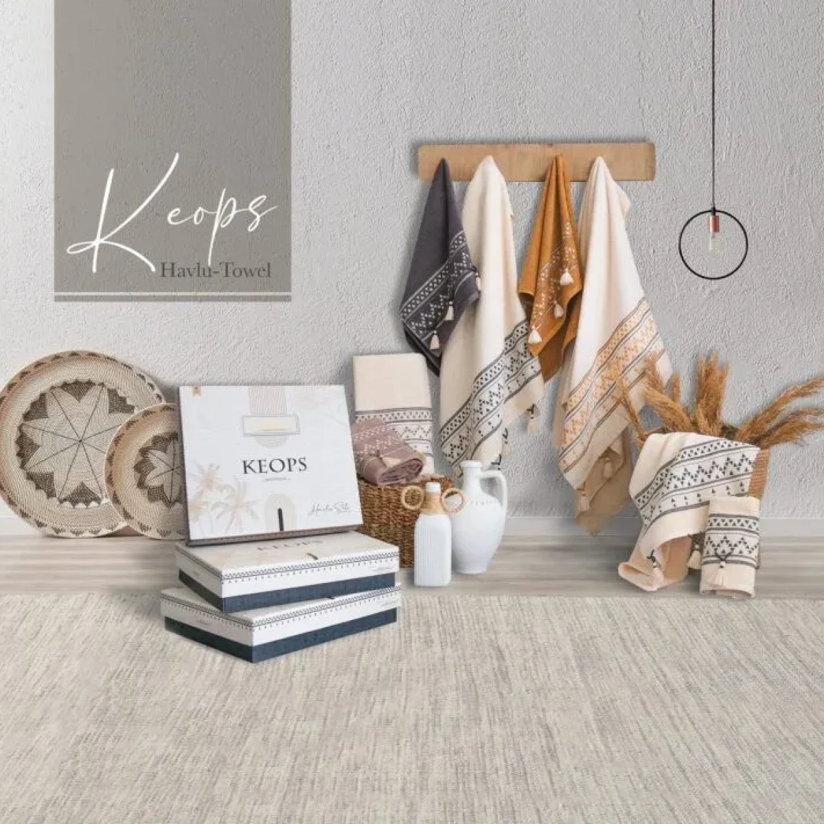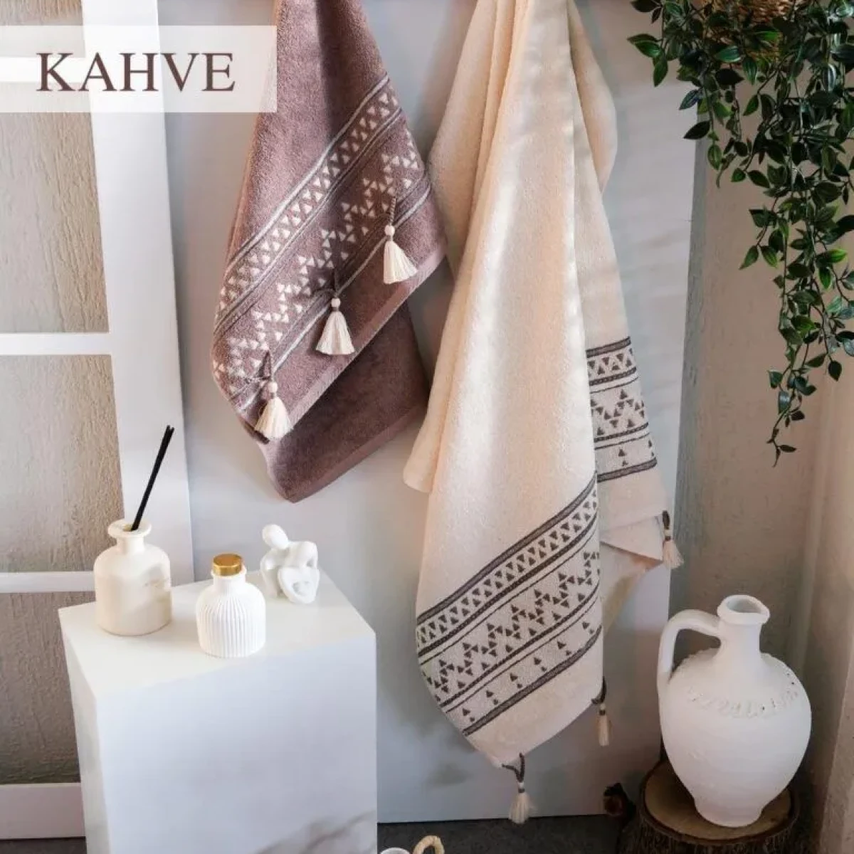 Цей набір поєднує елегантний етнічний орнамент, натуральні бавовняні волокна та декоративні китиці.